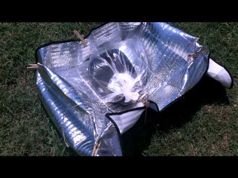 Video shows how to easily build very inexpensive solar ovens. total cost $7.50. Items needed: 2 cardboard boxes, black paint and a piece of glass. used newspaper to insulate oven. cost of optional swivel base $5.00. reaches high temperatures and cooks just about everything. plexiglass ... View Video